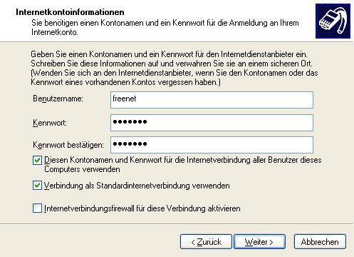 einrichten möchte und ob die Verbindungsfirewall aktiviert werden
